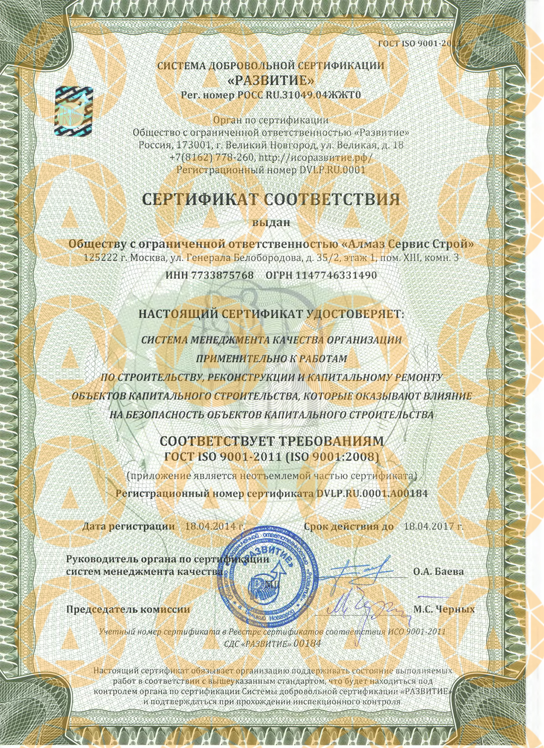 специалистов выполнят монолитные или кирпичные работы качественно и в срок. Так же мы предлагаем геодезические услуги в строительстве. Услуги геодезиста будут полезны на строительной площадке как в процессе строительства объекта так и после его завершения. Наши специалисты выполнят разбивку конструкций здания, вынос основных осей здания, перенос высотных отметок на монтажные горизонты, а так же выполнят все исполнительные съемки конструкций здания. Услуги геодезии будут полезны, если Вы занимаетесь фасадными работами. Наши геодезисты выполнят фасадную съемку и предоставят Вам данные в виде 2D или 3D модели в электронном и бумажном виде. По результатам результатам фасадной съемки, вы сможете оценить объемы работ и увидеть все неровности и отклонения фасада, а так же с легкостью смонтировать направляющие под панели. Компания "Алмаз Сервис Строй" предлагает услуги алмазного сверления отверстий в бетоне, железобетоне, кирпиче, камне и других твердых строительных материалах, мы предлагаем широкий диапазон диаметров отверстий. Сверление отверстий производится на любой высоте, под любым углом к поверхности и на любую глубину. Так же мы предлагаем алмазную резку и усиление проемов. Перед резкой проема мы рекомендуем провести обследование конструкций, в которых будут выполняться проемы, на этот случай у нас есть надежный партнер ООО "ЭКСПЕРТЪ", который выполнит техническое обследование в кротчайшие сроки. У нас работают квалифицированные специалисты, которые обеспечены лучшим оборудованием, что дает нам возможность выполнять все работы качественно, быстро и не создавая неудобств заказчику. Что такое алмазное бурение (сверление): Алмазное бурение (алмазное сверление) — это технологический процесс создания отверстий практически любого диаметра и глубины в строительном материале. Алмазное сверление с применением алмазного оборудования выполняется очень быстро и качественно, не создавая много шума и пыли, поэтому может производиться даже в эксплуатируемых зданиях, не создавая неудобств окружающим. Сверление отверстий в бетоне выполняется при любом армировании и под любым углом к поверхности. Работы производят с применением воды, что позволяет выполнять отверстия с идеально ровными краями, не требующими дальнейшей обработки. Область применения алмазного бурения (сверления): Область применения алмазного сверления (бурения) отверстий очень широка и будет особенно полезна при прокладке таких коммуникаций: